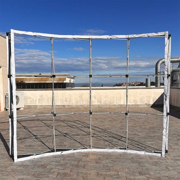 Forniamo il solo telo di copertura. È perfetto per essere utilizzato con il nostro modello di "fondale istantaneo". Si monta a quest'ultimo in pochi secondi e si è subito pronti per l'esibizione!