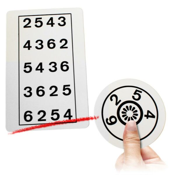 Il mago consegna a uno spettatore un cartoncino dove sono stampate cinque cifre diverse; poi mostra 5 dischetti dove si trovano, disposte a semicerchio, le stesse cifre del cartoncino.